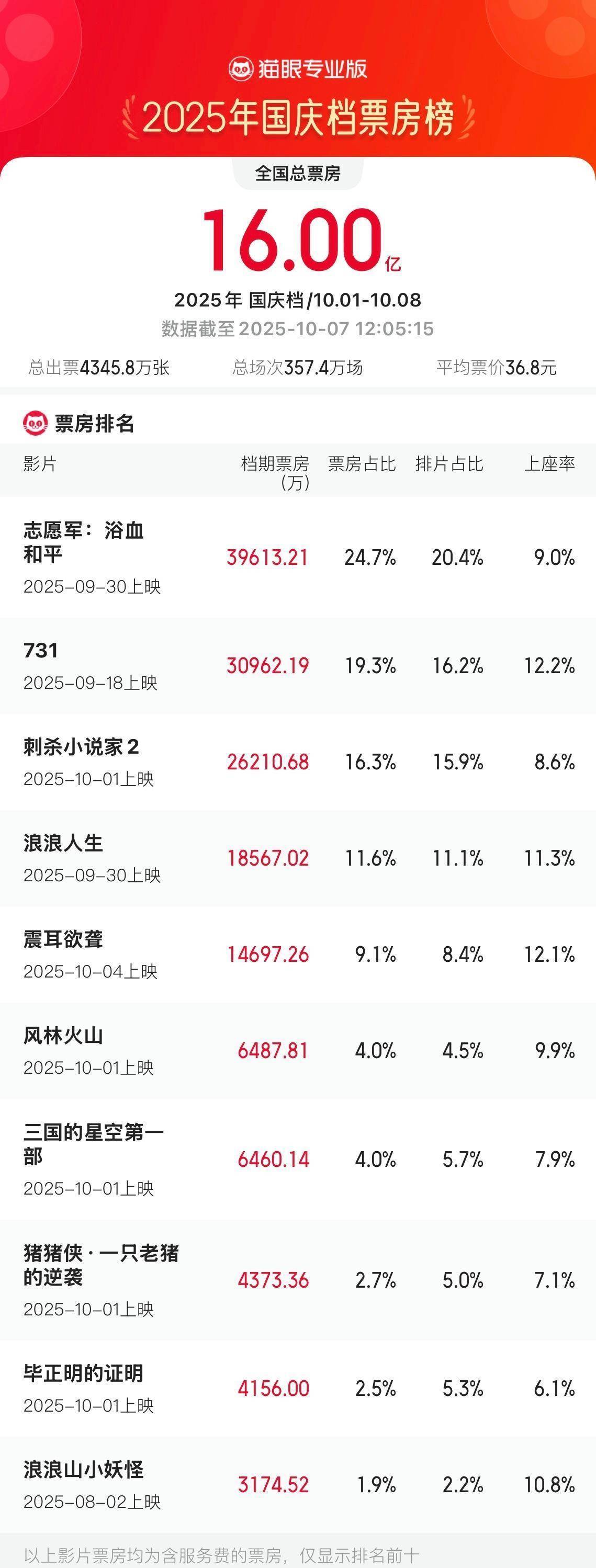 记者从猫眼获悉,截至10月7日12时05分,2025年国庆档档期票房已破16亿元。《志愿军:浴血和平》《731》《刺杀小说家2》分列前三位。